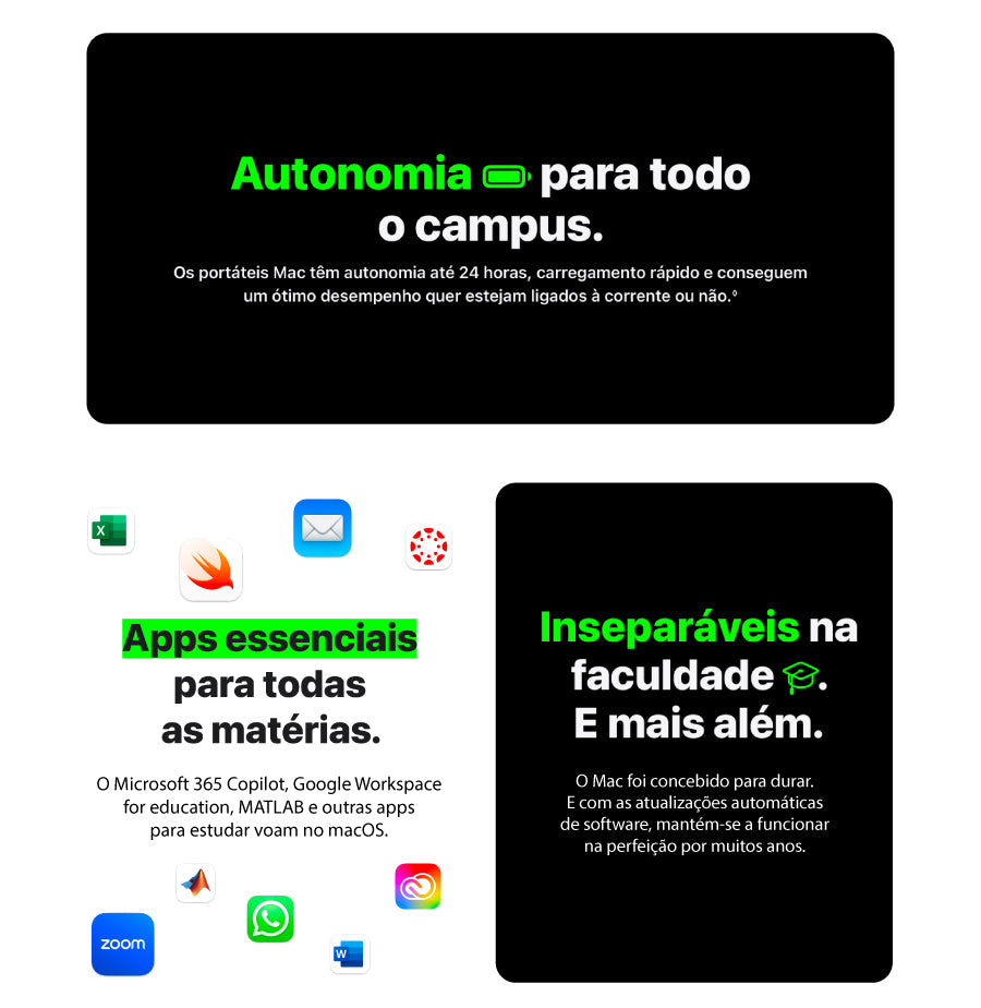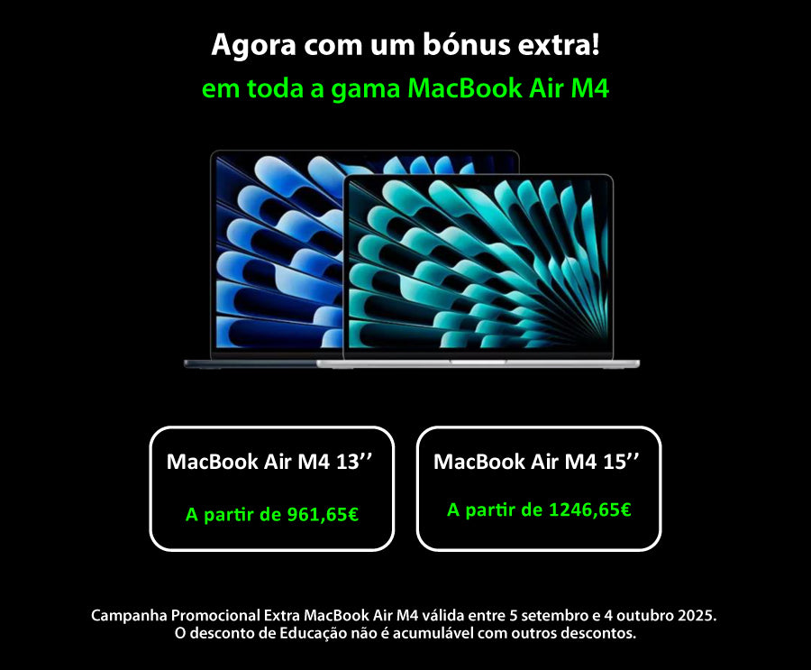 Campanha Promocional de Regresso às aulas válida em compras de Educação, de MacBook Air, MacBook Pro e iPad, realizadas entre 13 de julho e 11 de outubro de 2025, limitada a 1 Mac e 1 iPad por cliente, válida para Estudantes universitários: indivíduos maiores de 18 anos, com estatuto comprovado de frequência universitária/superior e Professores: indivíduos, maiores de 18 anos, com um estatuto comprovado de professor/docente numa Instituição de Ensino Básico, Secundário ou Superior, mediante apresentação da documentação obrigatória. Em compras de Educação na loja online é obrigatório o registo prévio no Protocolo de Educação, para Estudantes Universitários e Professores.